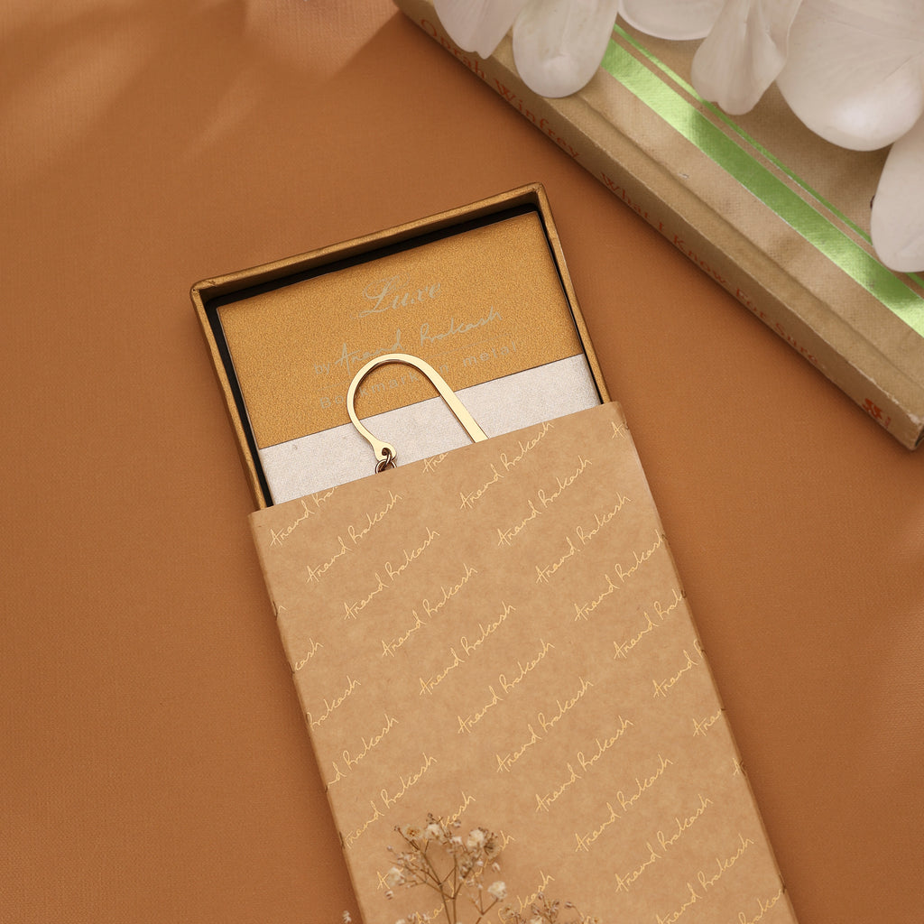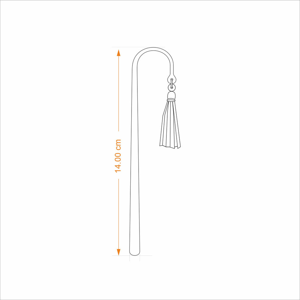 A sleek brass bookmark finished with a soft leather tassel, capped in polished metal. It hooks neatly over the spine of your book, marking your page with quiet elegance. A timeless accessory for readers who love a touch of luxury with every chapter.