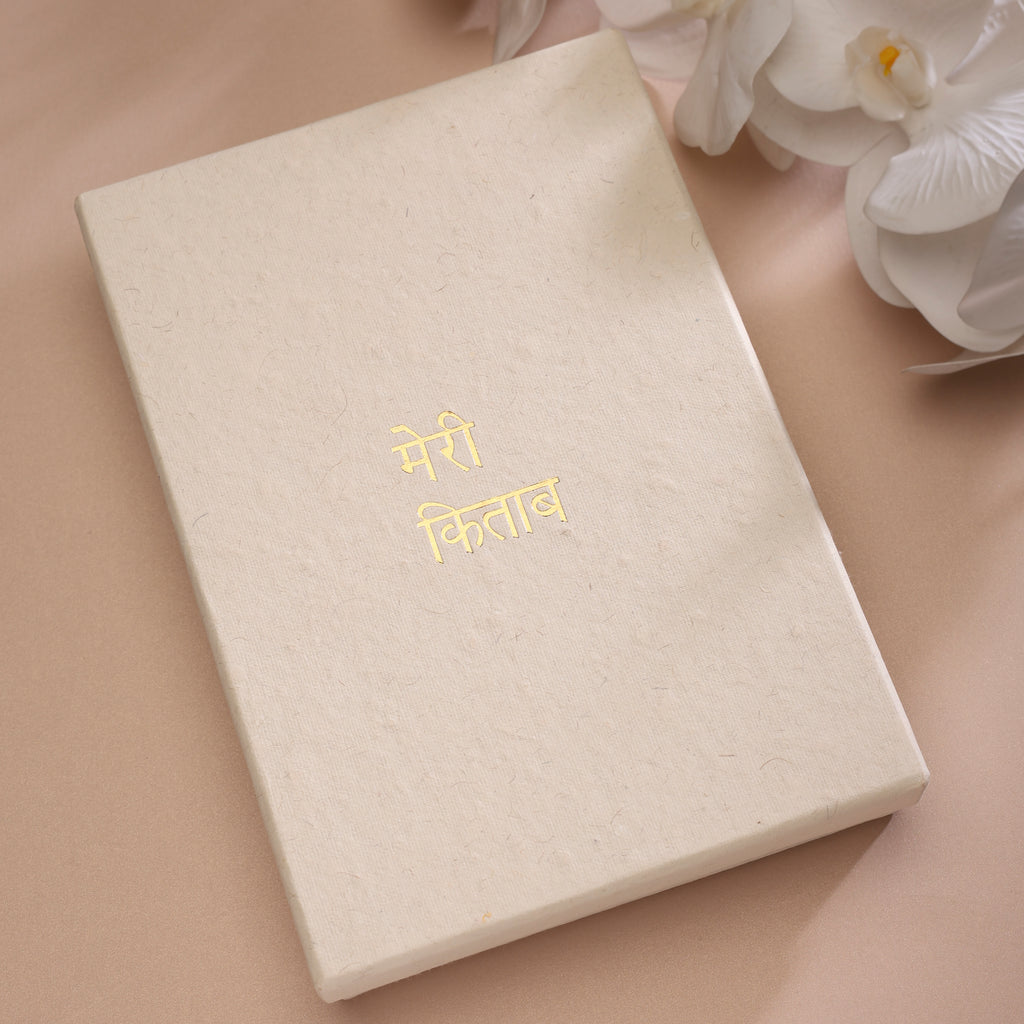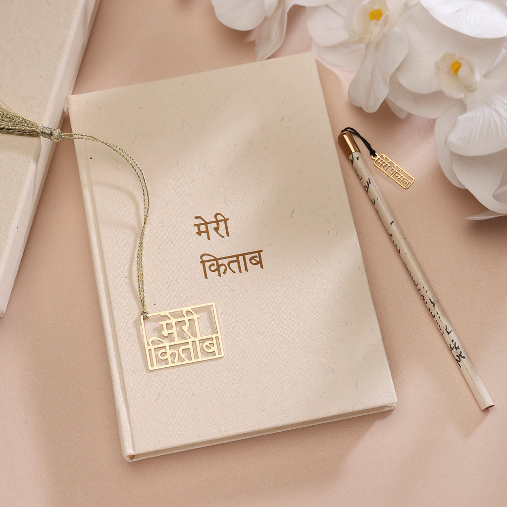 Our Meri Kitab notebook is the perfect space for writing your thoughts, ideas, dreams, and adventures. Includes a complimentary bookmark and pencil with a "Meri Kitab" goldplated charm comes in a handmade paper gift box