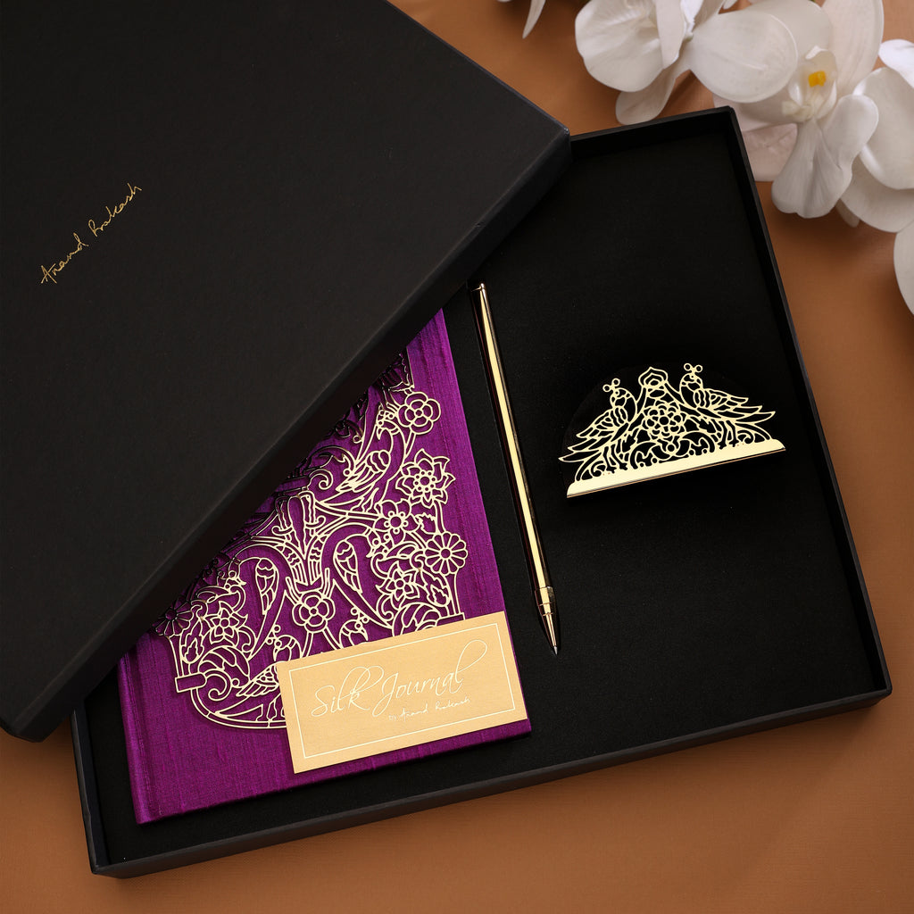 The set features a Handloom Silk-Bound Journal, adorned with an intricate Peacock Symphony motif in finely detailed brass. It is a timeless companion for thoughts, reflections, and creativity.