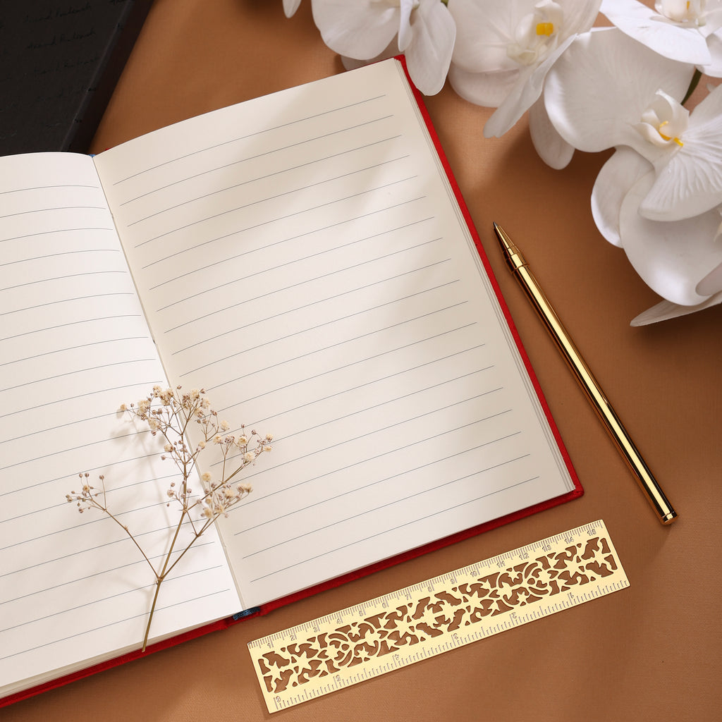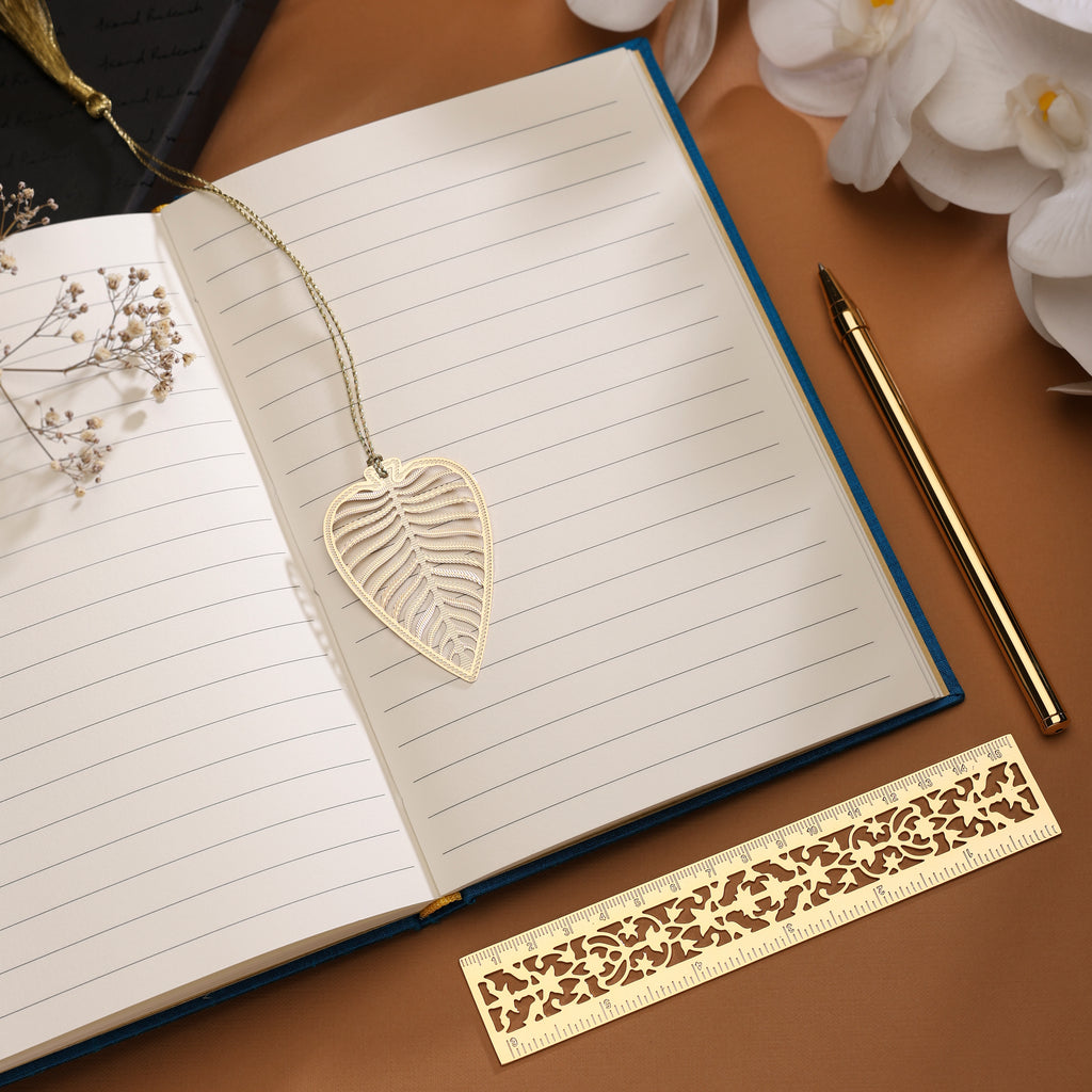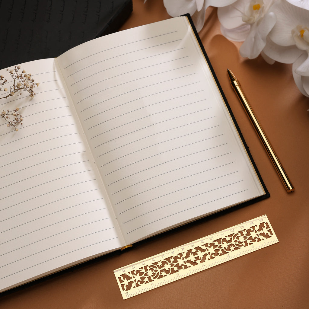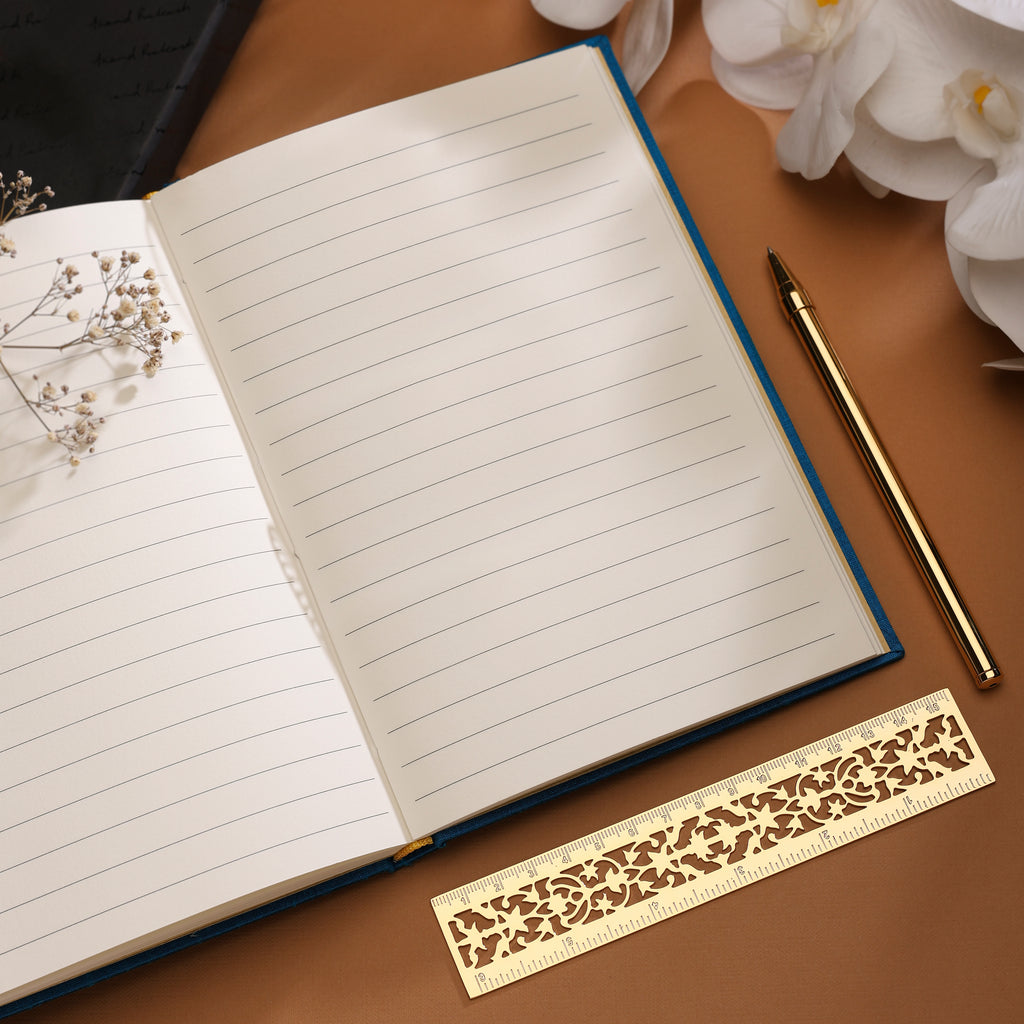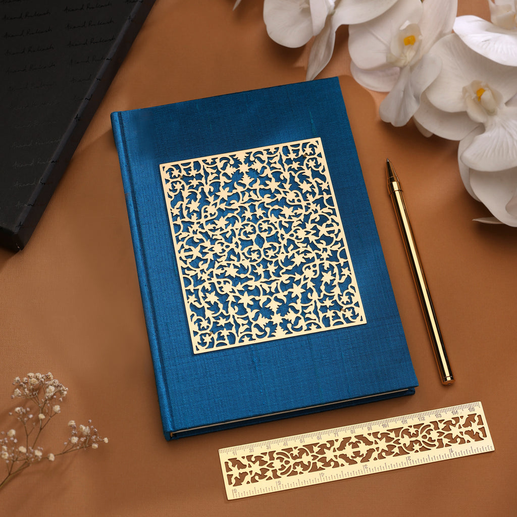 A luxurious gift set inspired by the timeless jaalis of the Taj Mahal. At its heart is a raw silk journal, crowned with an intricate brass cut-work panel that echoes its patterns. A matching brass scale and sleek brass pen complete the ensemble, all presented in an elegant gift box—perfect for collectors, connoisseurs of design, and those who love to write.