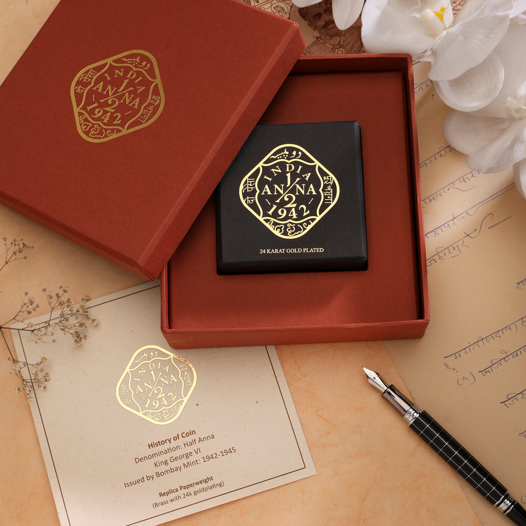 A large paperweight in the shape of a vintage half anna coin. The paperweight is crafted from brass with a goldplated finish.
