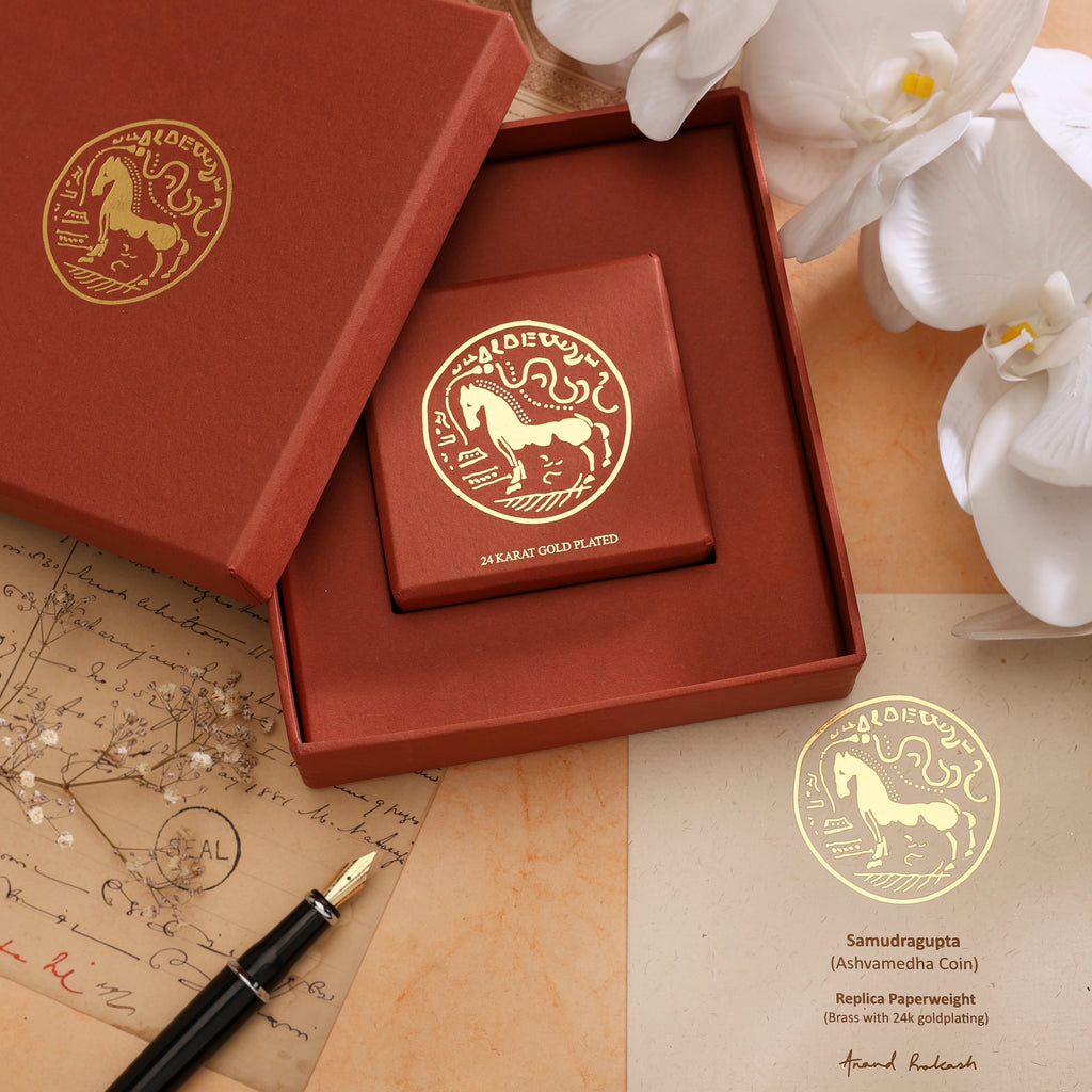 A replica paperweight in the shape of a King Samudragupta Ashvamedha coin from our numismatic range. The paperweight is crafted from brass with 24K goldplating.