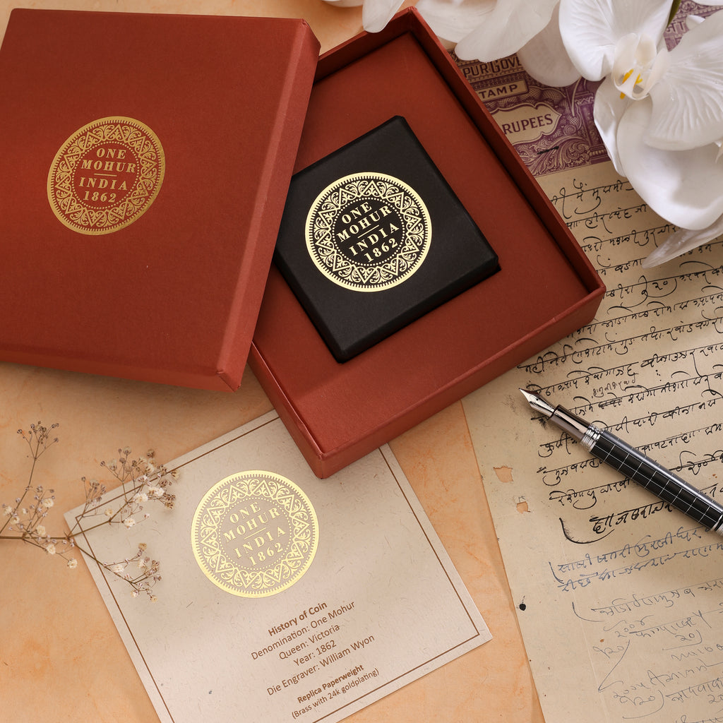 NUMISMATIQUE, a play on the word numismatics, is a range inspired by Anand Prakash's hobby of collecting British-India silver coins. In the past, he has spent considerable time searching for old Indian coins across cities, villages, nooks, corners of bazaars and village markets. Our team meticulously traced old coins to create this range of limited-edition notebooks, paperweights, cufflinks, bookmarks, journals and notepads. (Numismatics means the study or collection of coins.)