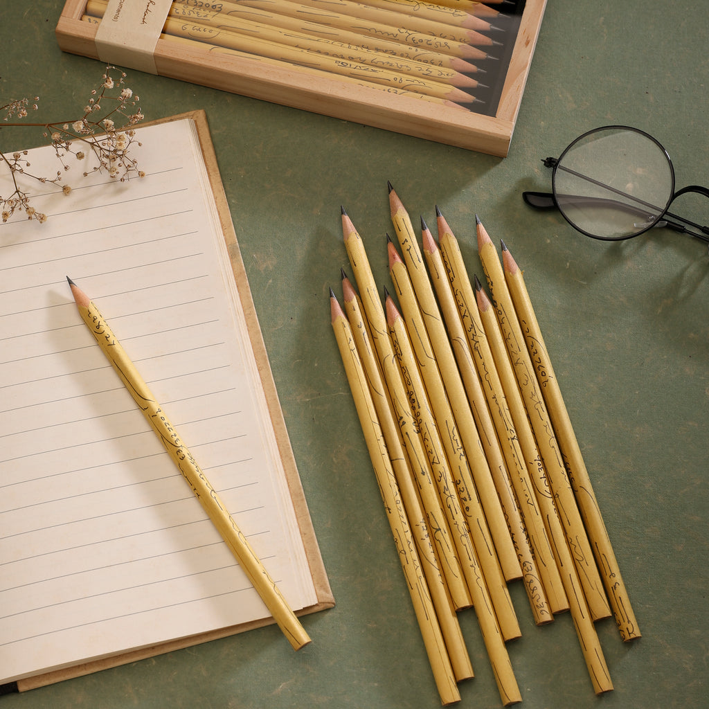 A quiet tribute to India’s paper heritage—crafted for those who still love the feel of graphite on paper. Ledger Lines is a set of 12 pencils, crafted with authentic vintage Bahi-Khata (old accounting ledger) documents. No two pencils are ever the same—every piece carries its own markings, dates, and textures, turning an everyday essential into a small collectable.
