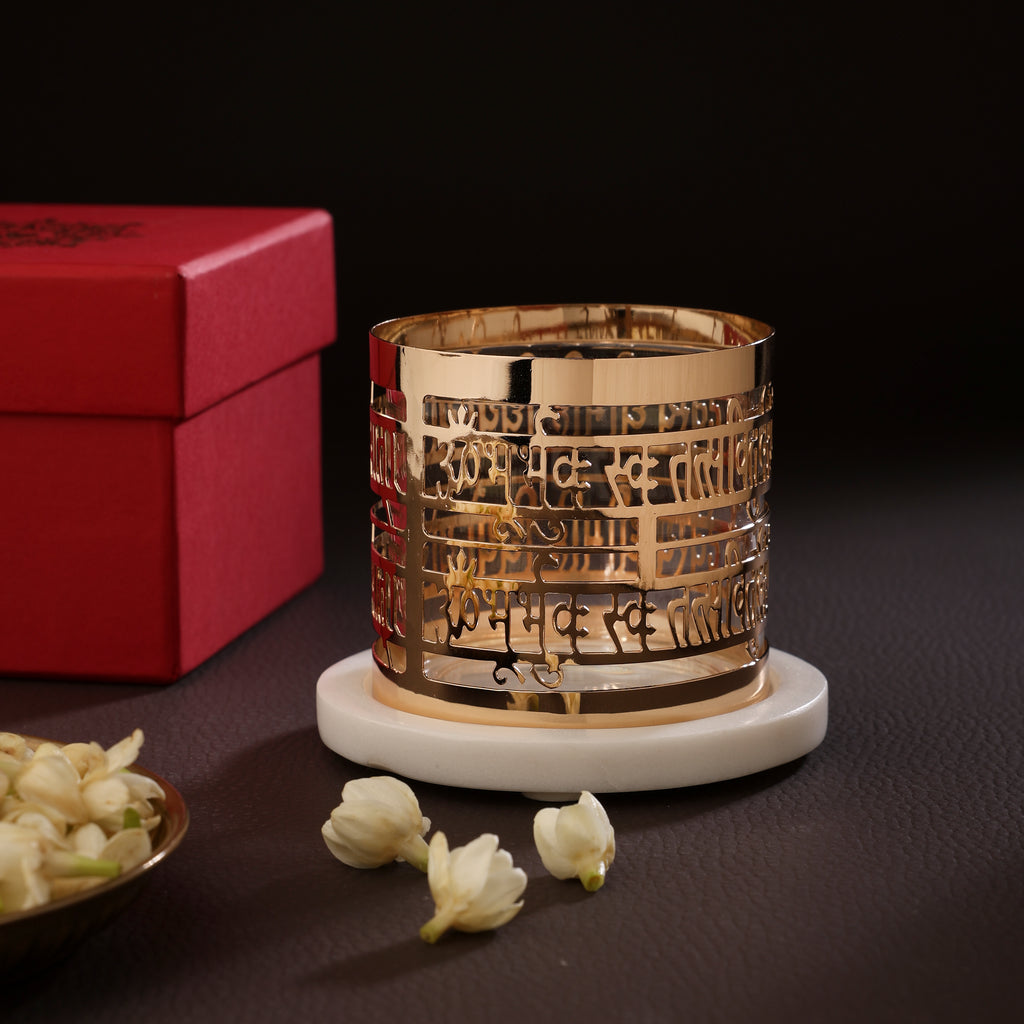 An intricate brass tealight holder inspired by the sacred Gayatri Mantra. The circular motif rests on a smooth white marble base and includes a clear borosilicate glass cup to hold the tea light candle, creating a soft, meditative glow for your space.